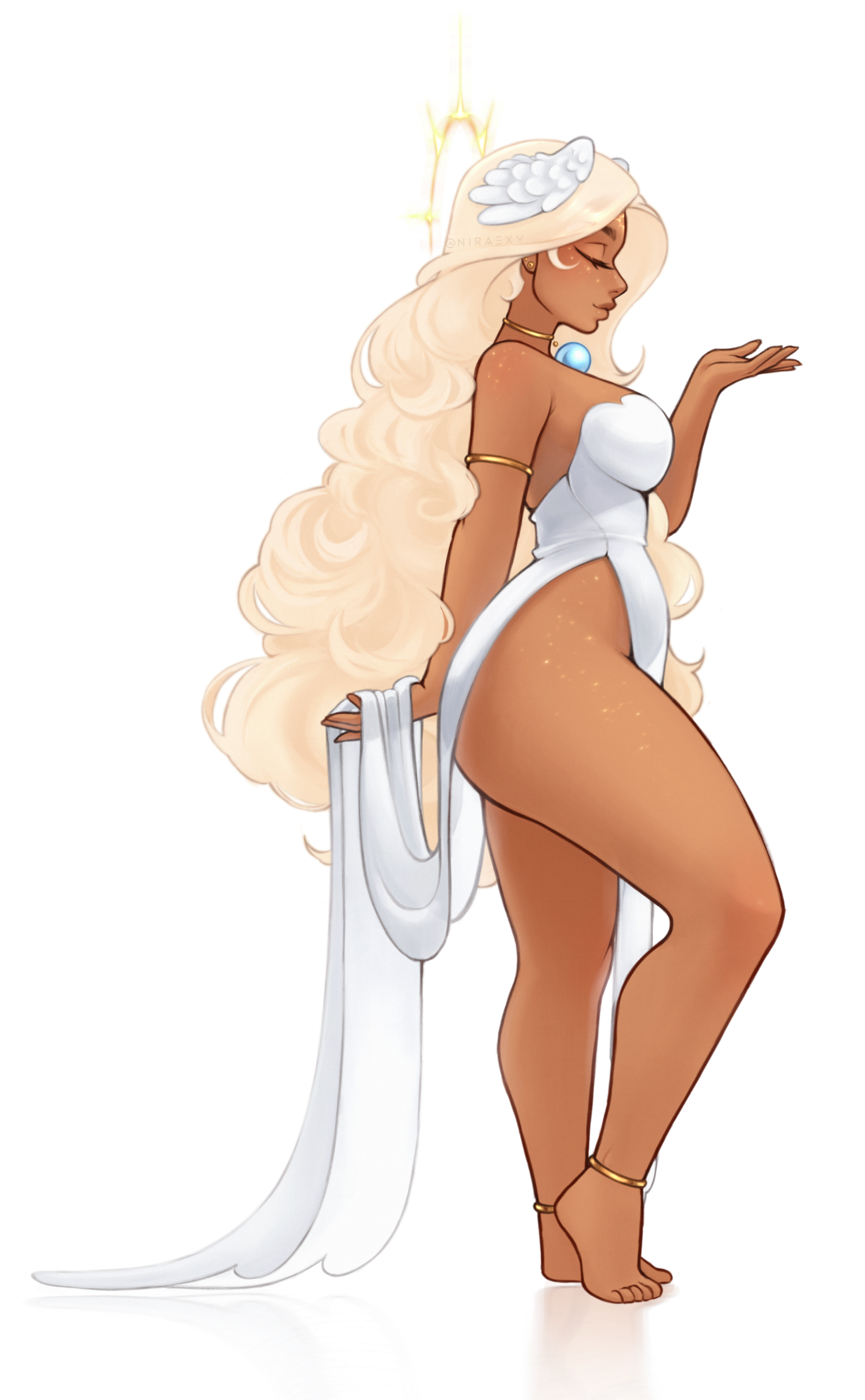 Canon Outfit: white double-slit dress with golden arm and ankle rings/bracelets, and always wears a golden choker with a big blue Gem Orb