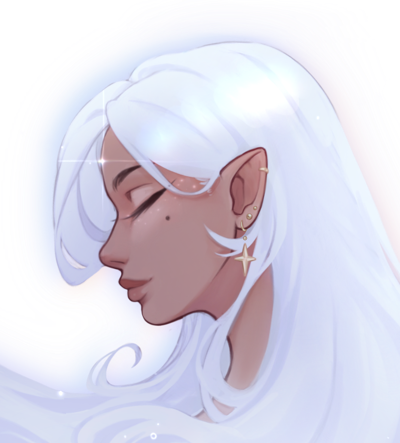 Star on forehead & Sparkly Speckles (Star "Freckles") on: cheekbones, shoulders, chest, hips. Overall, skin has a glimmering, sparkly texture.