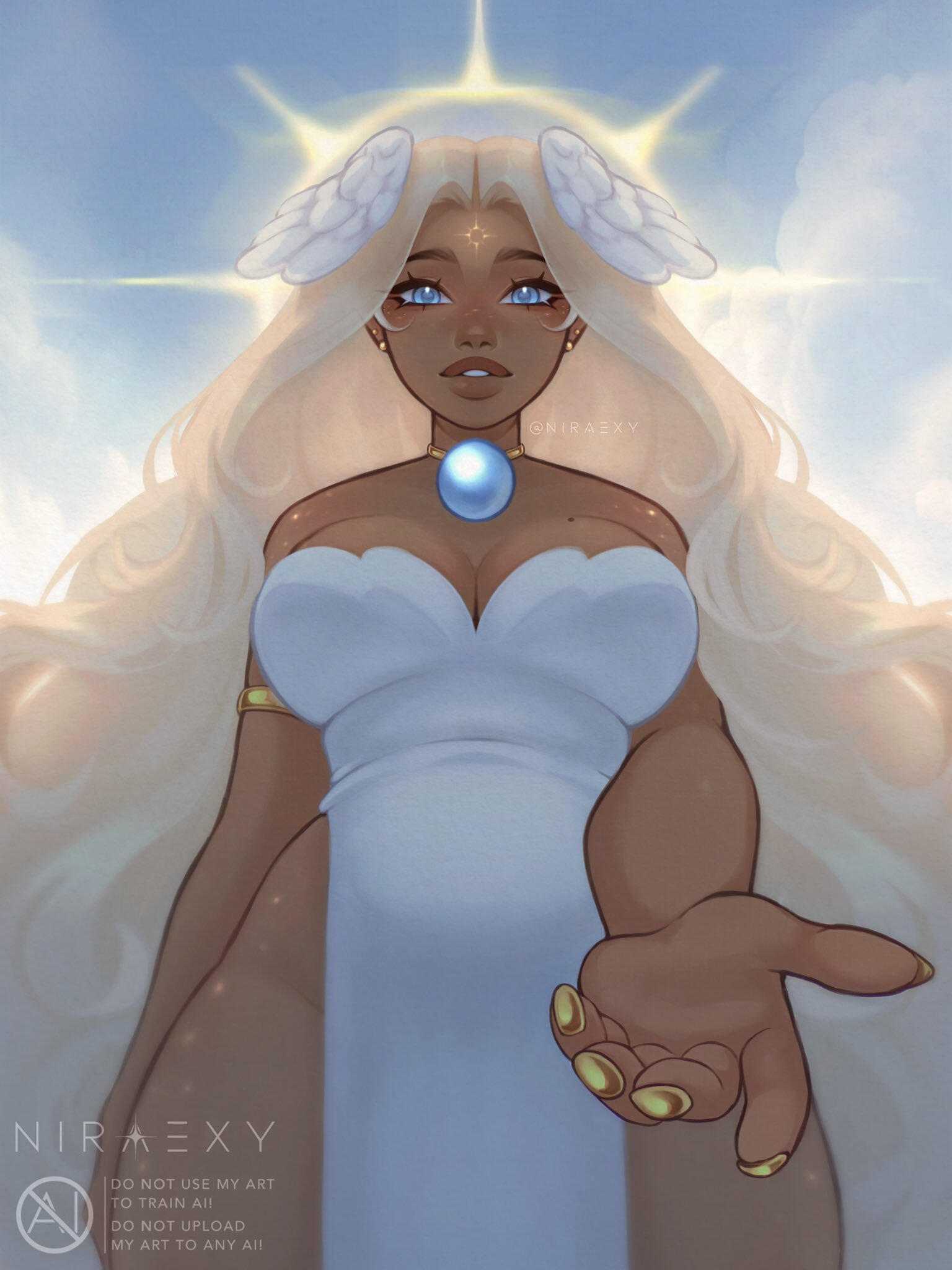 Canon Outfit: white double-slit dress with golden arm and ankle rings/bracelets, and always wears a golden choker with a big blue Gem Orb